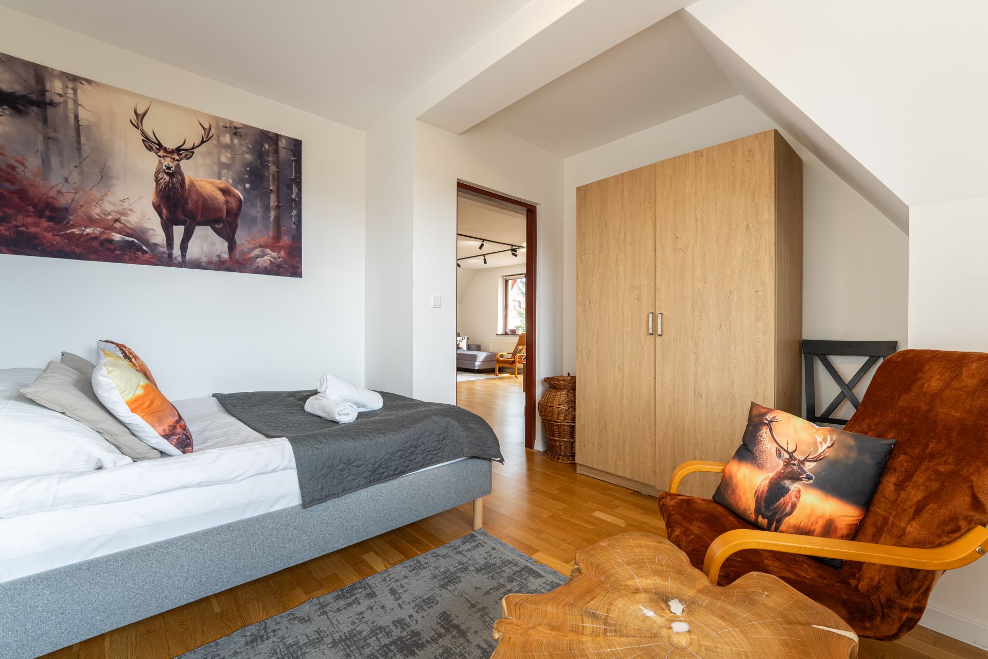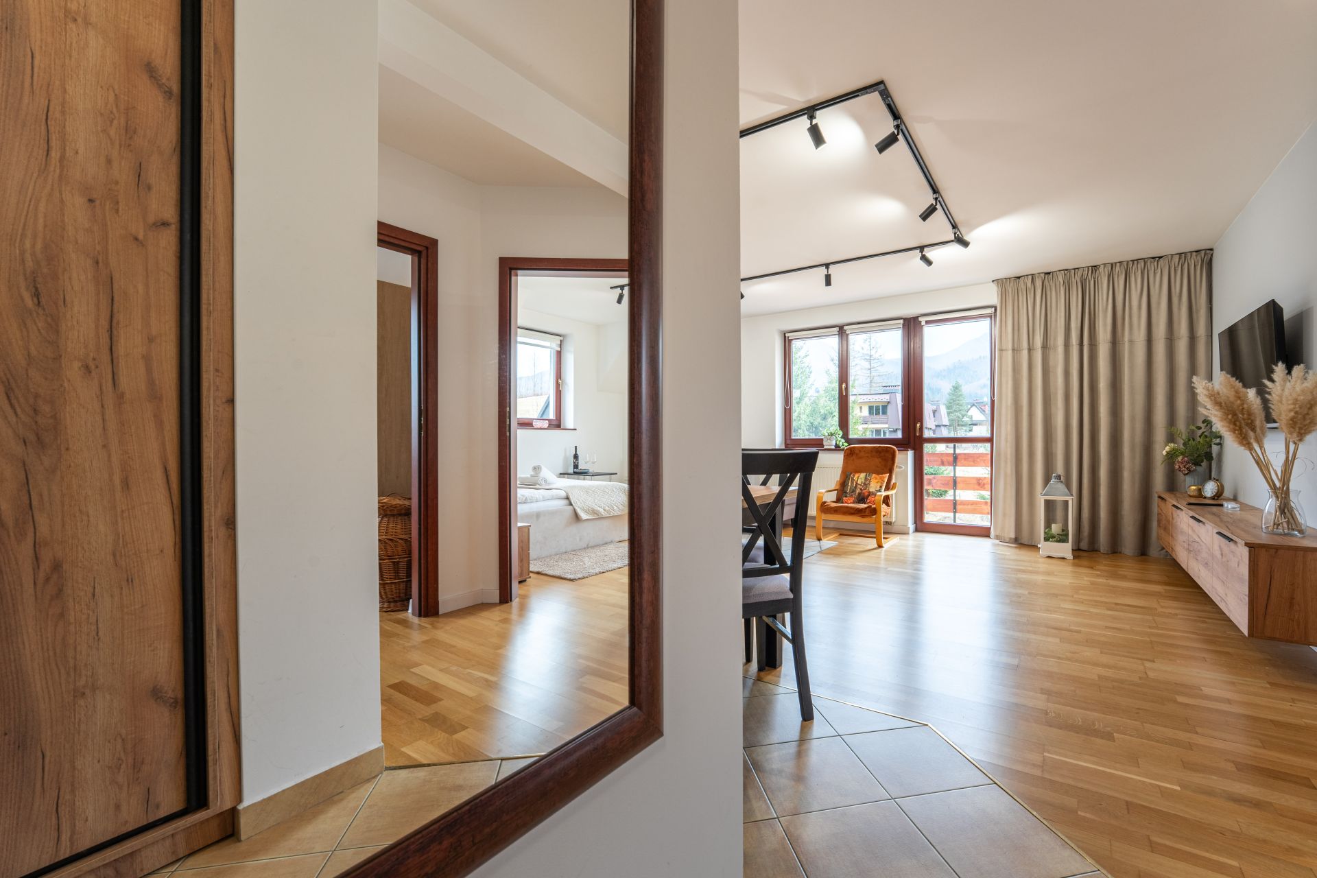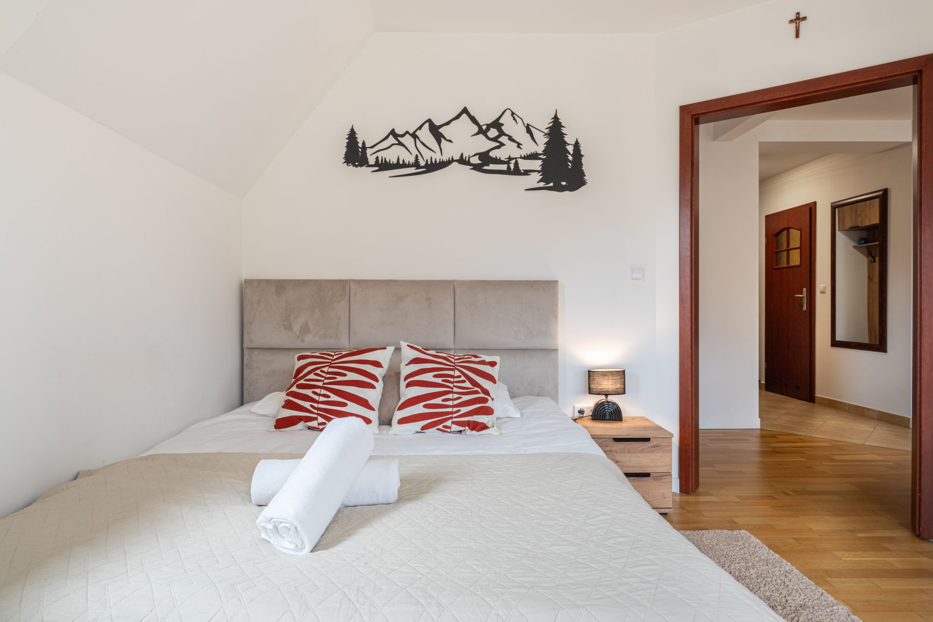 Apartament składa się z dwóch pokoi, salonu z aneksem kuchennym i łazienki. Znajduje się w nim wygodne łóżko małżeńskie o wymiarach 160 x 200 cm, zapewniające spokojny sen, rozkładana kanapa (140 x 200 cm), idealna do odpoczynku po aktywnym dni oraz rozkładany narożnik (235 x 235)