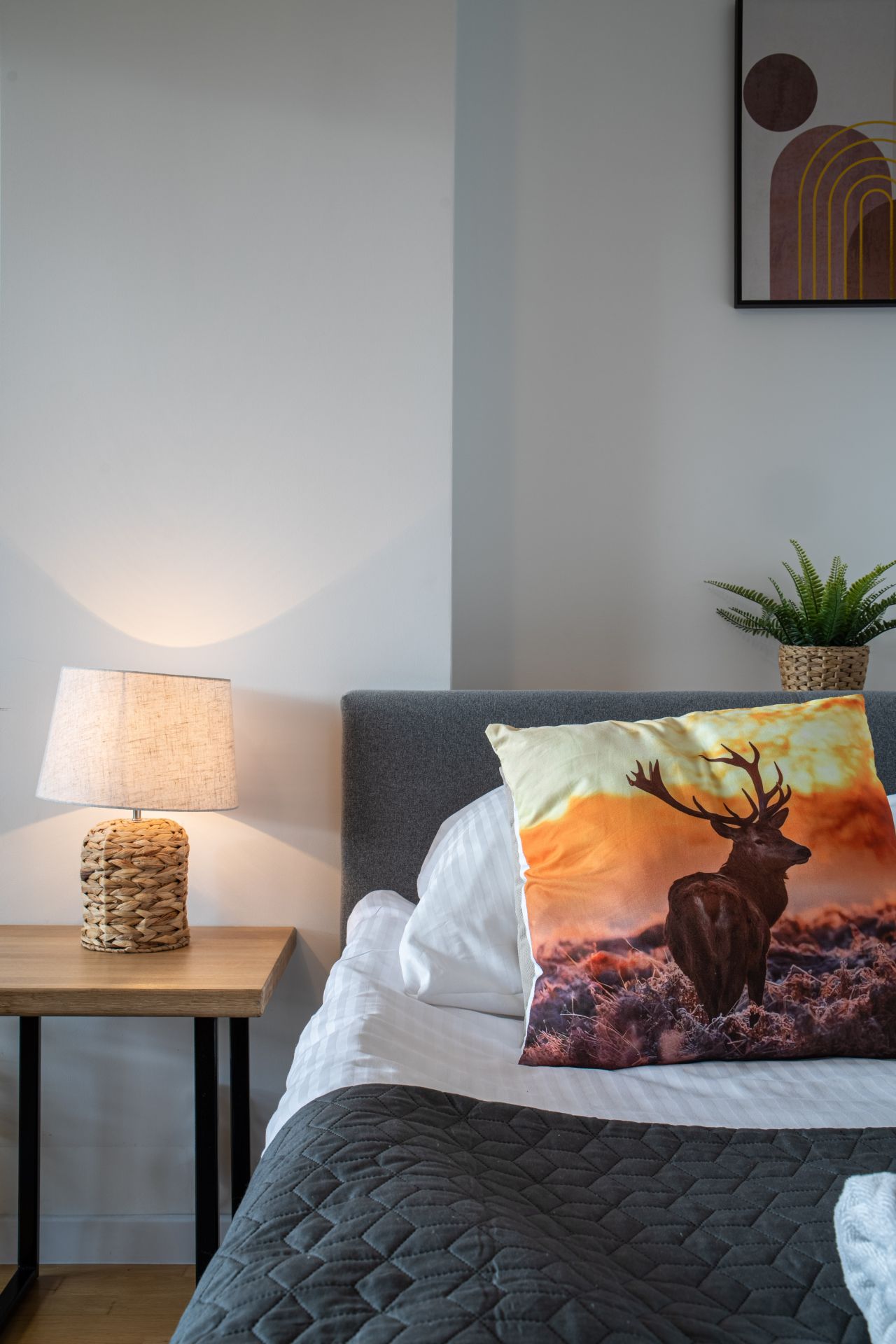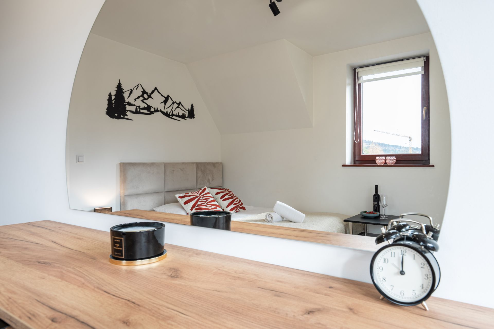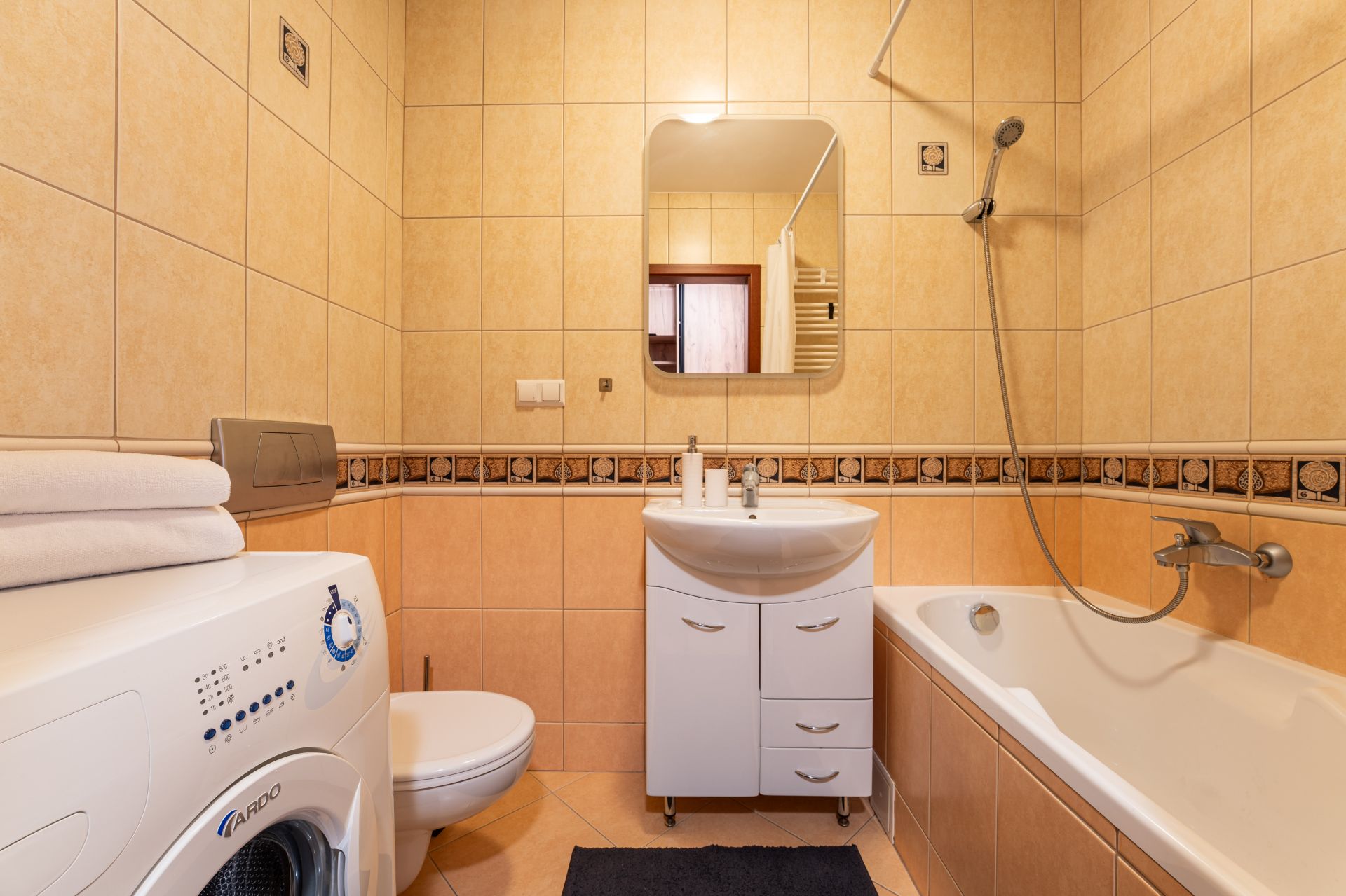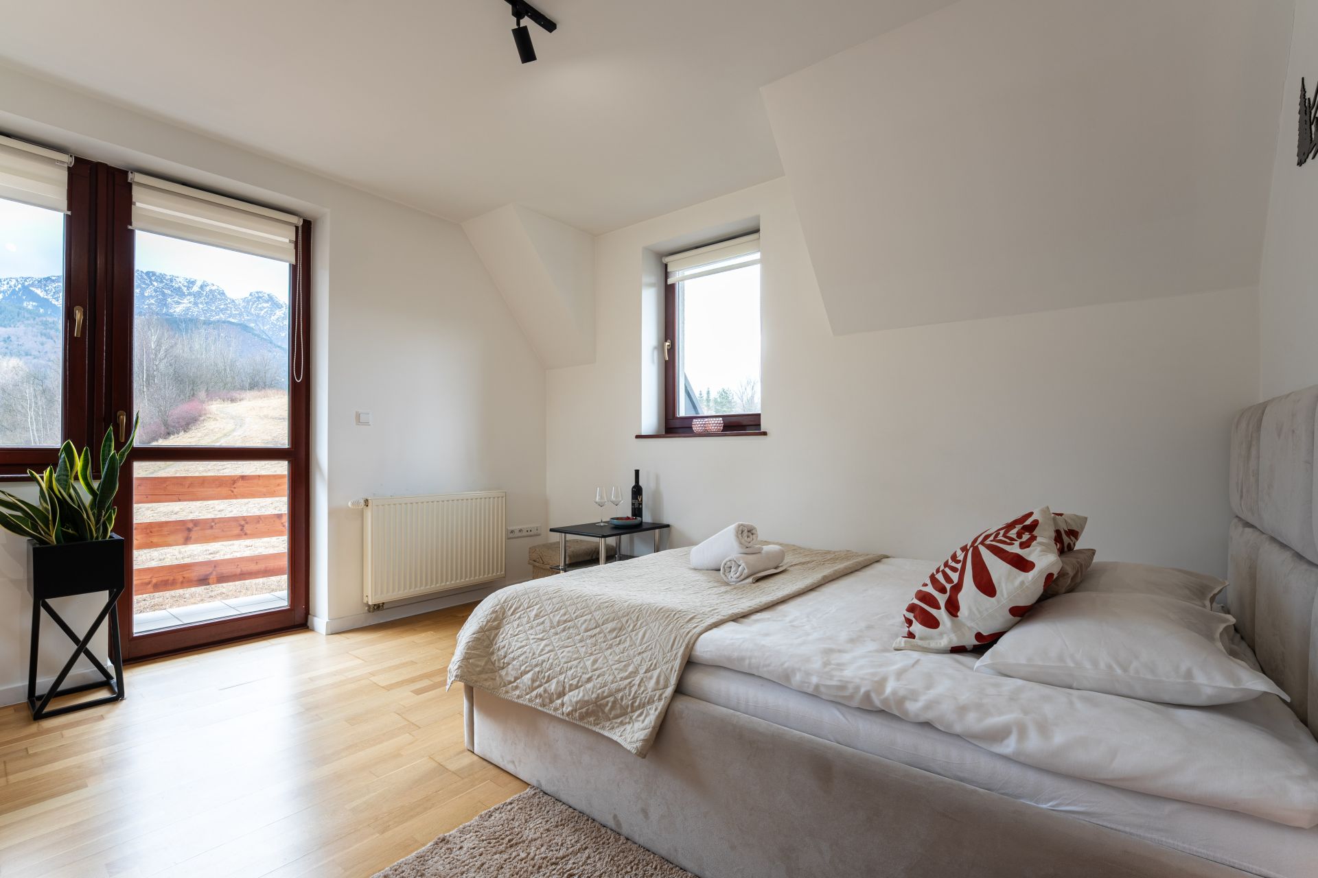 Apartament składa się z dwóch pokoi, salonu z aneksem kuchennym i łazienki. Znajduje się w nim wygodne łóżko małżeńskie o wymiarach 160 x 200 cm, zapewniające spokojny sen, rozkładana kanapa (140 x 200 cm), idealna do odpoczynku po aktywnym dni oraz rozkładany narożnik (235 x 235)