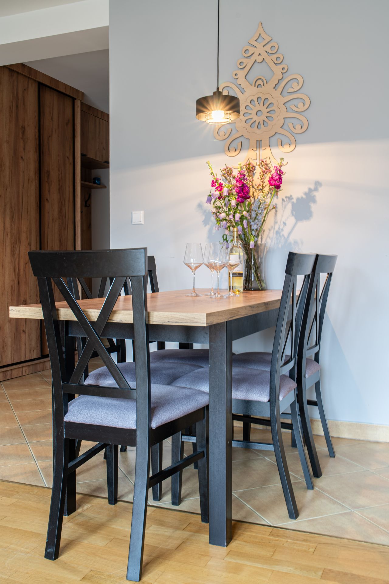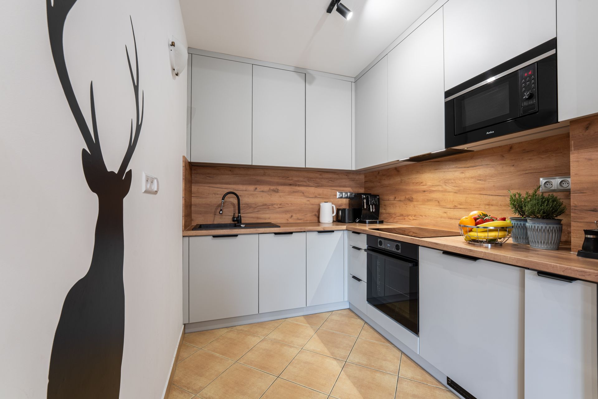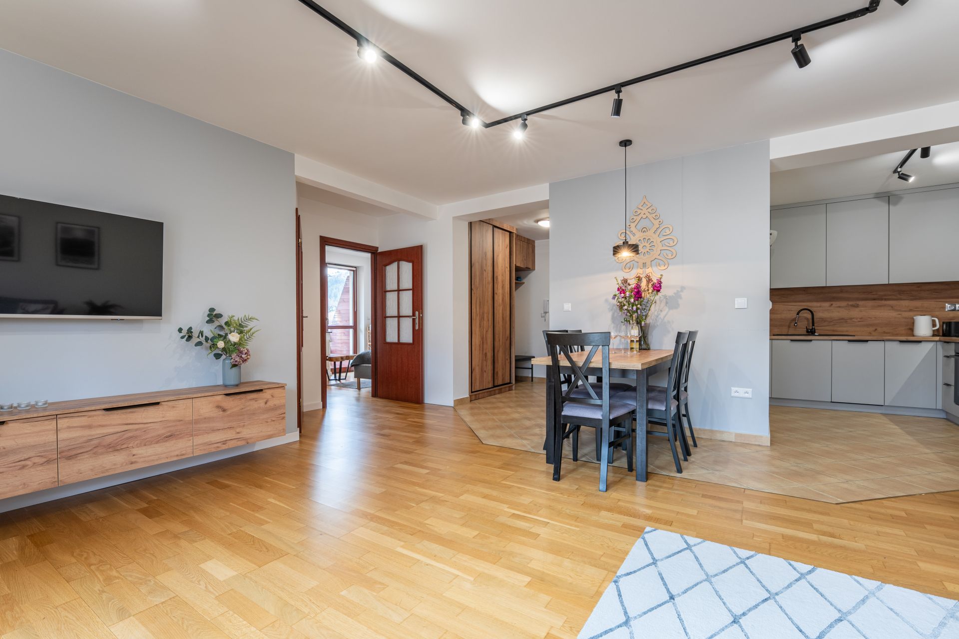 Goście mają do dyspozycji dobrze wyposażoną kuchnię ze zmywarką, lodówką, piekarnikiem, mikrofalówką oraz niezbędnymi akcesoriami. W mieszkaniu dostępny jest również telewizor ze SmartTV oraz bezpłatny Internet. Dodatkowym atutem apartamentu jest balkon z widokiem na Giewont.